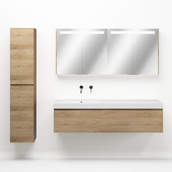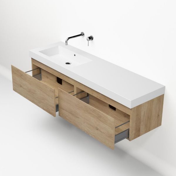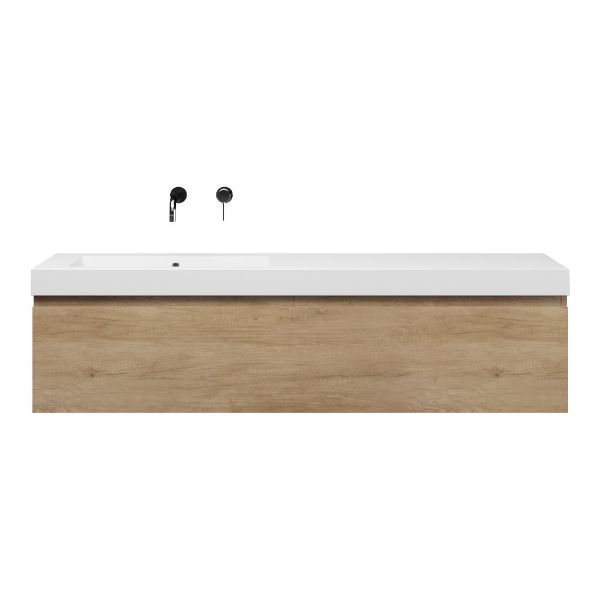 Greeploos badkamermeubel in de kleur olm is 160 cm breed. De wastafel is vervaardig in polystone en heeft de kleur wit. Dit badkamermeubel met deze wastafel is leverbaar tussen de 60 cm t/m 160 cm