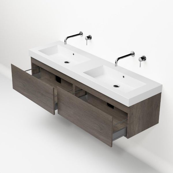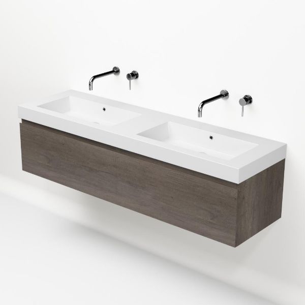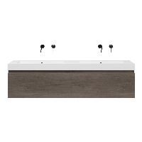 Greeploos badkamermeubel in de kleur olm donker grijs is 160 cm breed. De wastafel is vervaardig in polystone en heeft de kleur wit. Dit badkamermeubel met deze wastafel is leverbaar tussen de 60 cm t/m 160 cm