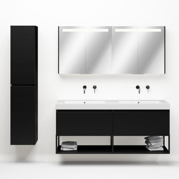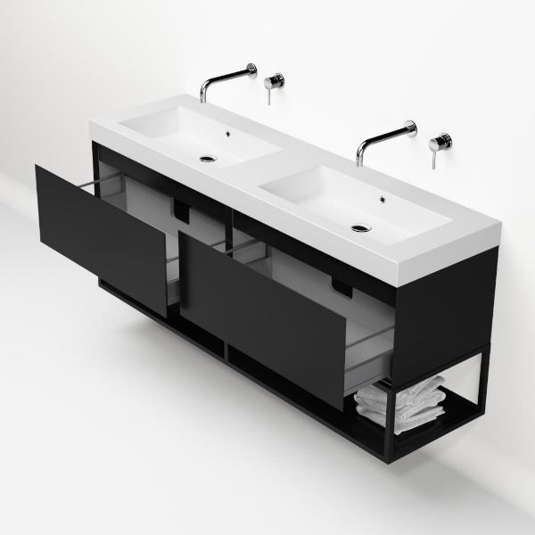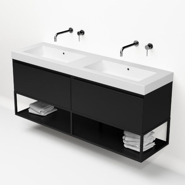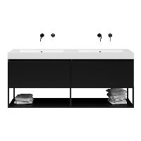 | | Bellanti Solo/Tela/Esta-Q badmeubel 160x46 2 softclose laden mat zwart greeploos quartz dubbele wastafel mat wit zonder kraangaten met mat zwart metalen frame |