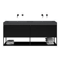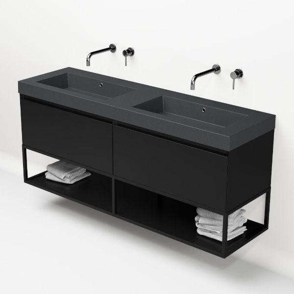| | Bellanti Solo/Tela/Esta-Q badmeubel 160x46 2 softclose laden mat zwart greeploos quartz dubbele wastafel mat grijs zonder kraangaten met mat zwart metalen frame |
