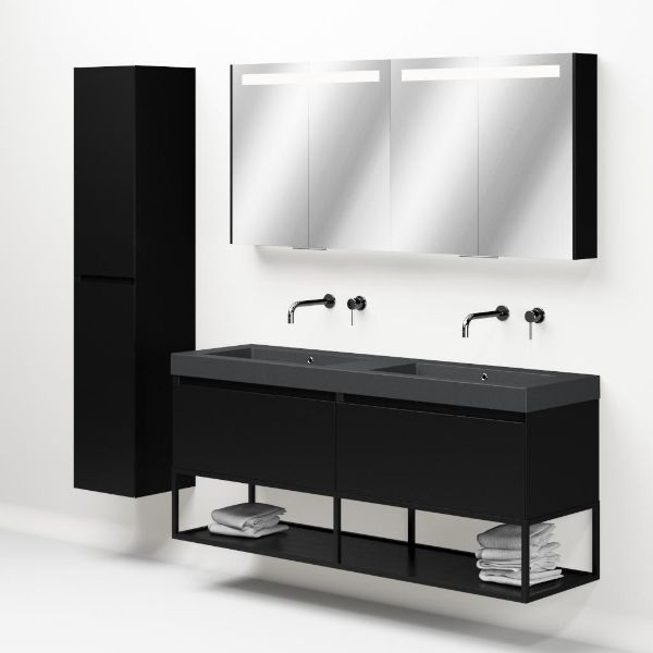 Greeploos badkamermeubel in de kleur zwart mat is 160 cm breed. De wastafel is vervaardig in quartz en heeft de kleur grijs mat quartz. Dit badkamermeubel met deze wastafel is leverbaar tussen de 60 cm t/m 160 cm