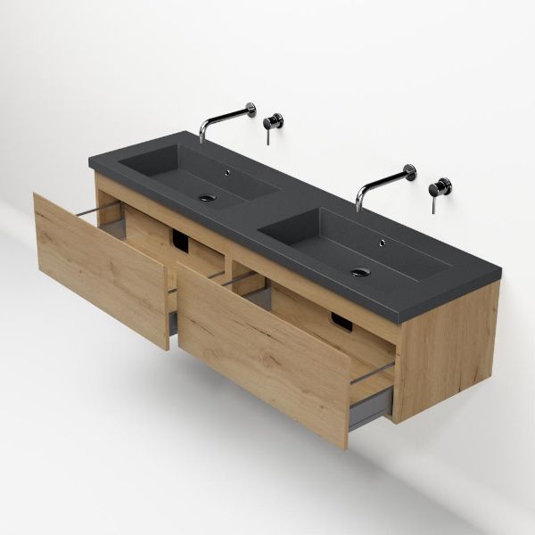 Bellanti Solo/Esta-Q badmeubel 160x46 2 softclose laden eiken natuur greeploos quartz dubbele wastafel mat grijs zonder kraangaten