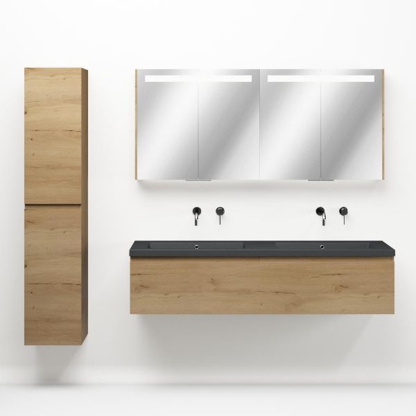 Greeploos badkamermeubel in de kleur eiken natuur is 160 cm breed.  De wastafel is vervaardig in quartz en heeft de kleur grijs mat quartz. Dit badkamermeubel met deze wastafel is leverbaar tussen de 60 cm t/m 160 cm