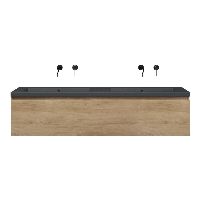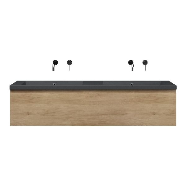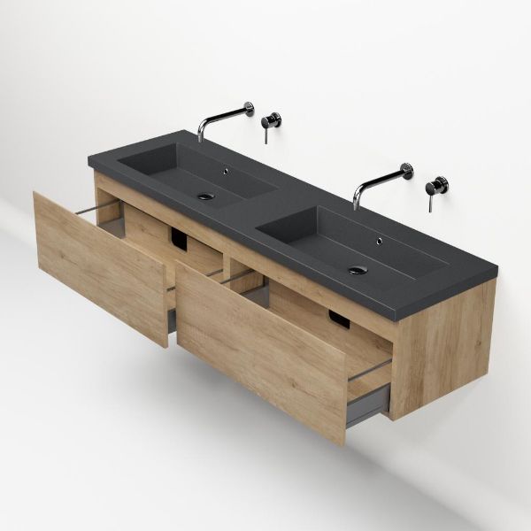 Greeploos badkamermeubel in de kleur olm is 160 cm breed.  De wastafel is vervaardig in quartz en heeft de kleur grijs mat quartz. Dit badkamermeubel met deze wastafel is leverbaar tussen de 60 cm t/m 160 cm