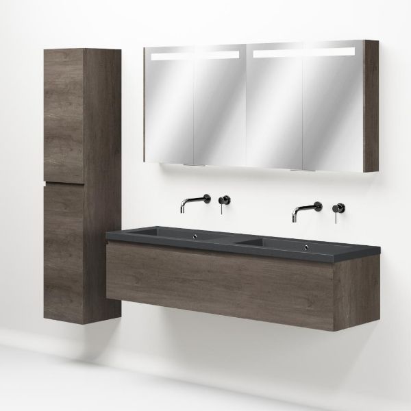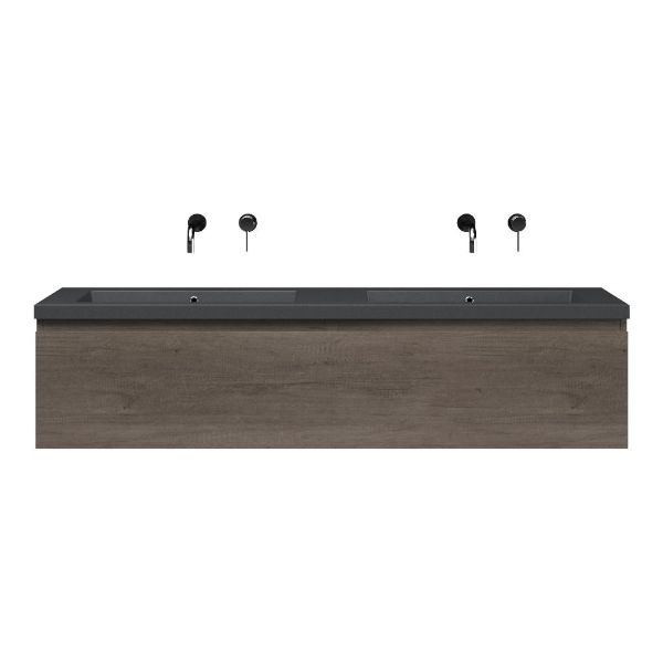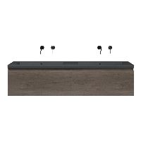 Greeploos badkamermeubel in de kleur olm donker grijs is 160 cm breed.  De wastafel is vervaardig in quartz en heeft de kleur grijs mat quartz. Dit badkamermeubel met deze wastafel is leverbaar tussen de 60 cm t/m 160 cm