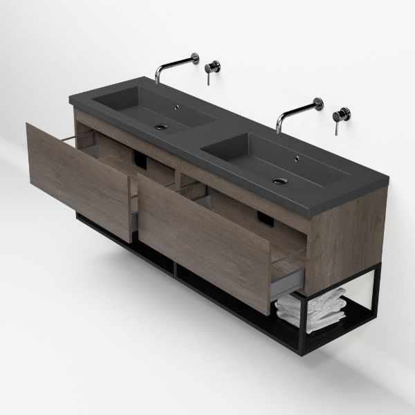 | | Bellanti Solo/Tela/Esta-Q badmeubel 160x46 2 softclose laden olm donker grijs greeploos quartz dubbele wastafel mat grijs zonder kraangaten met mat zwart metalen frame |