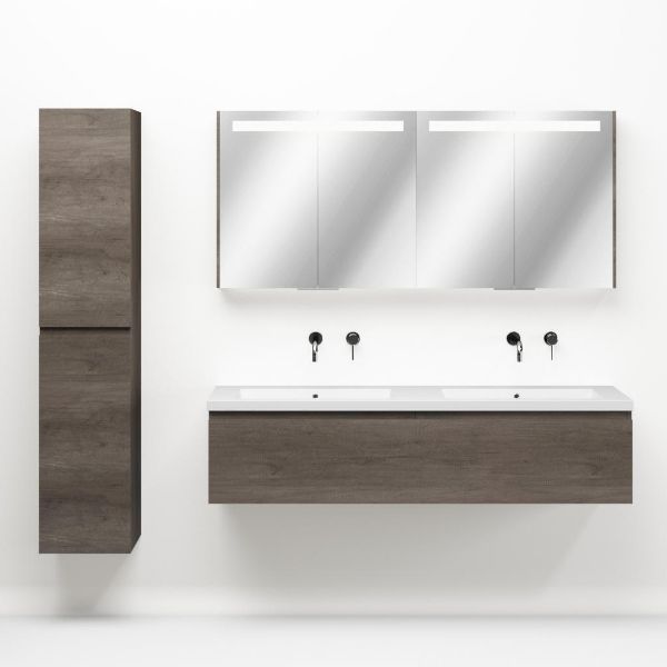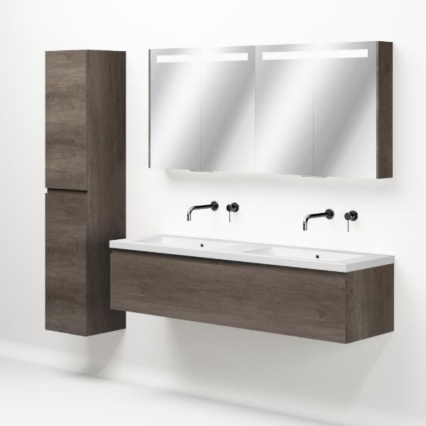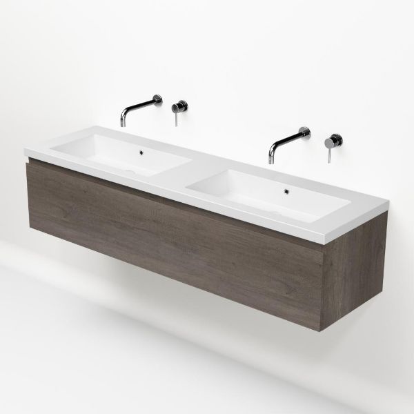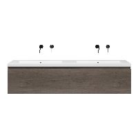 Greeploos badkamermeubel in de kleur olm donker grijs is 160 cm breed. De wastafel is vervaardig in quartz en heeft de kleur wit mat quartz. Dit badkamermeubel met deze wastafel is leverbaar tussen de 60 cm t/m 160 cm