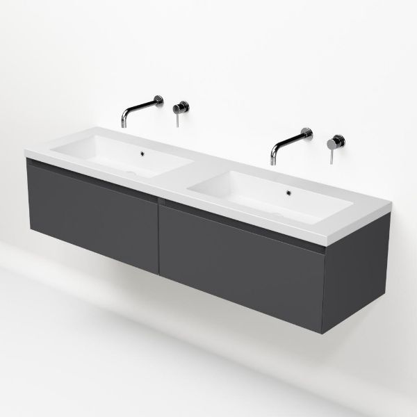 | Bellanti Solo/Esta-Q badmeubel 160x46 2 softclose laden mat antraciet greeploos quartz dubbele wastafel mat wit zonder kraangaten |