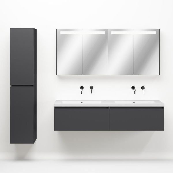 Greeploos badkamermeubel in de kleur antraciet mat is 160 cm breed. De wastafel is vervaardig in quartz en heeft de kleur wit mat quartz. Dit badkamermeubel met deze wastafel is leverbaar tussen de 60 cm t/m 160 cm