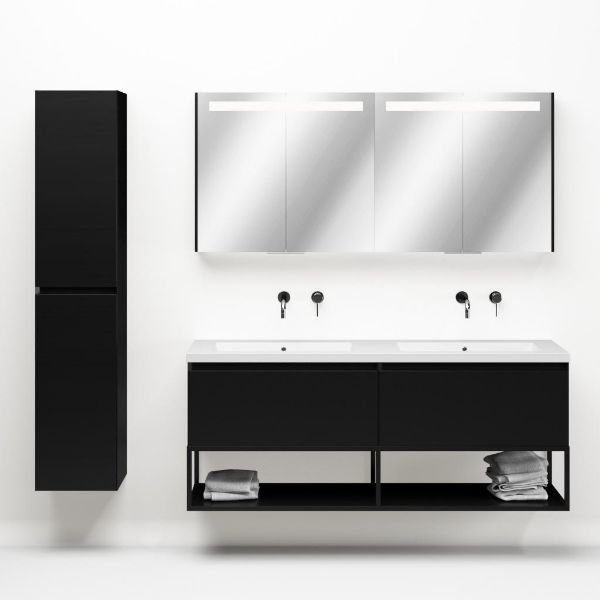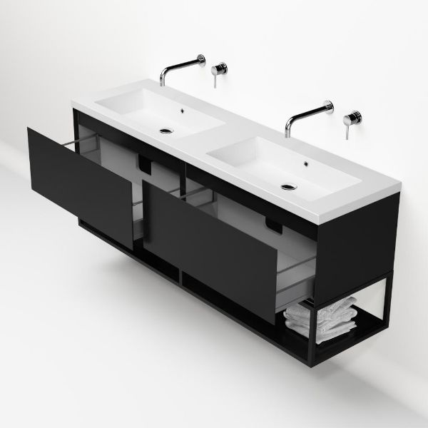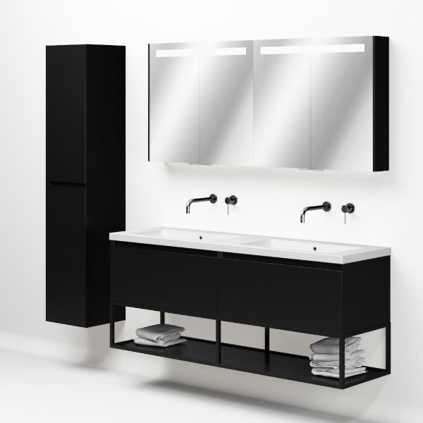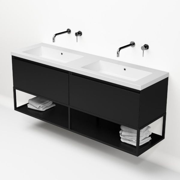 | | Bellanti Solo/Tela/Esta-Q badmeubel 160x46 2 softclose laden mat zwart greeploos quartz dubbele wastafel mat wit zonder kraangaten met mat zwart metalen frame |