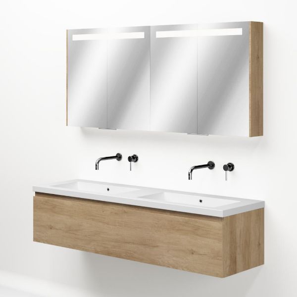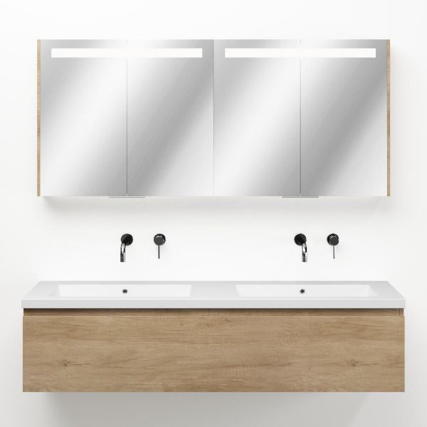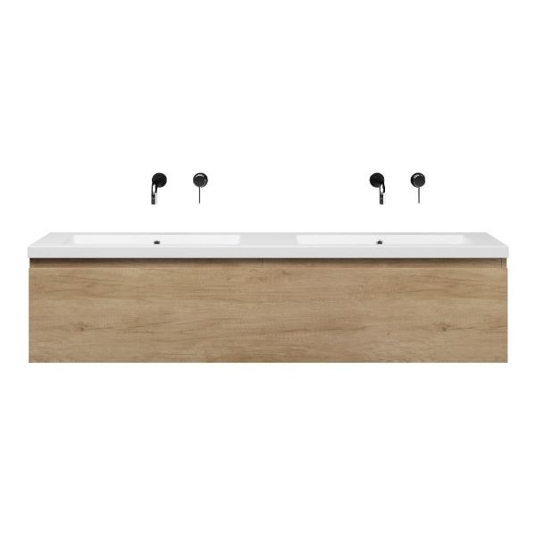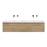 Greeploos badkamermeubel in de kleur olm is 160 cm breed.  De wastafel is vervaardig in quartz en heeft de kleur wit mat quartz. Dit badkamermeubel met deze wastafel is leverbaar tussen de 60 cm t/m 160 cm