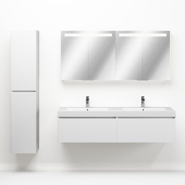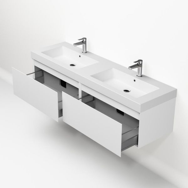 Greeploos badkamermeubel in de kleur wit mat is 160 cm breed. De wastafel is vervaardig in quartz en heeft de kleur wit mat. Dit badkamermeubel met deze wastafel is leverbaar tussen de 60 cm t/m 160 cm