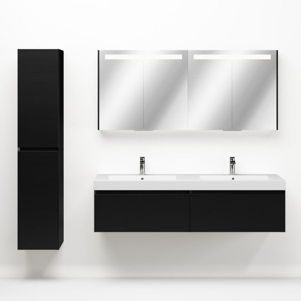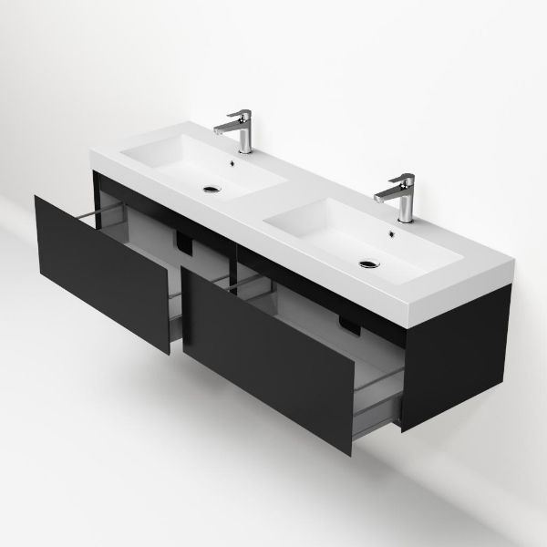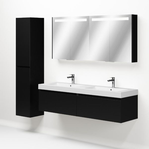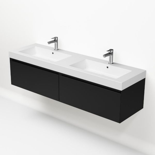 Greeploos badkamermeubel in de kleur zwart mat is 160 cm breed. De wastafel is vervaardig in quartz en heeft de kleur wit mat. Dit badkamermeubel met deze wastafel is leverbaar tussen de 60 cm t/m 160 cm