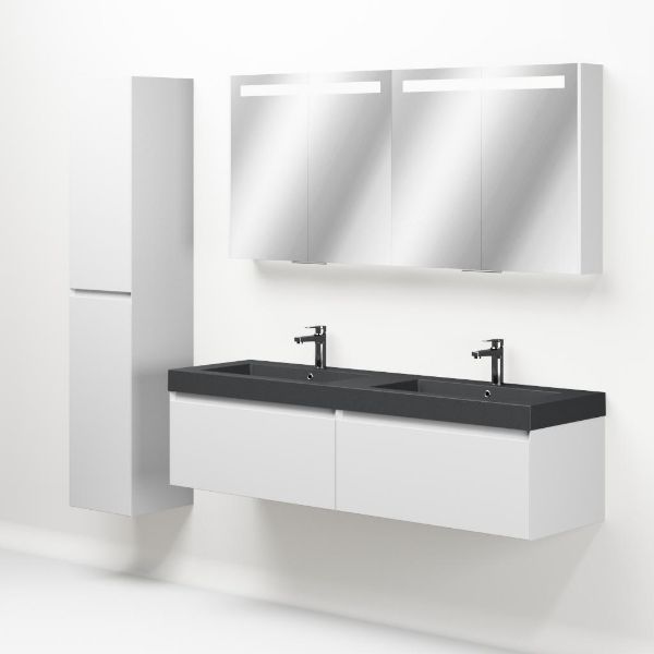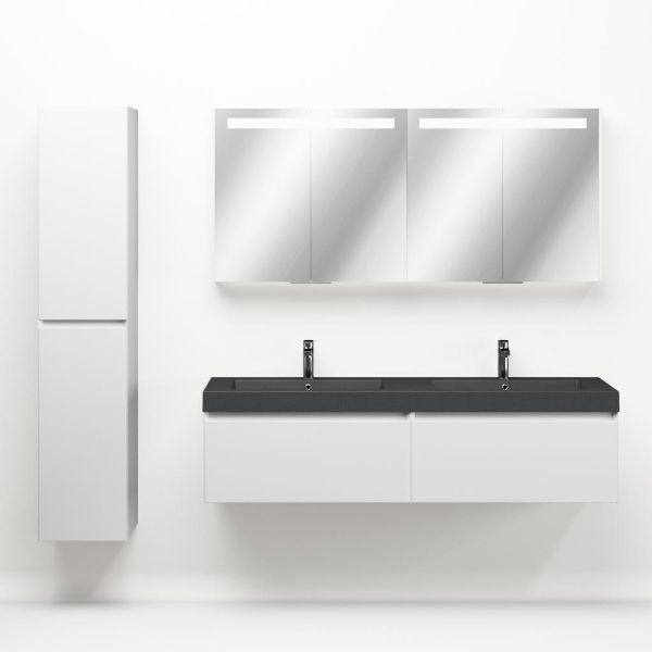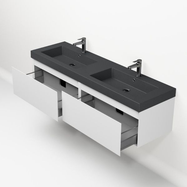 Greeploos badkamermeubel in de kleur wit mat is 160 cm breed. De wastafel is vervaardig in quartz en heeft de kleur grijs mat. Dit badkamermeubel met deze wastafel is leverbaar tussen de 60 cm t/m 160 cm