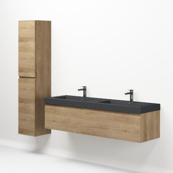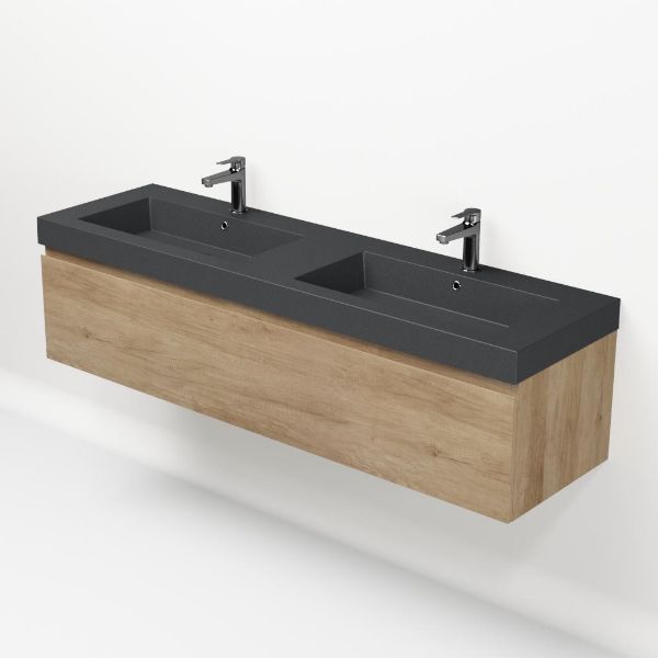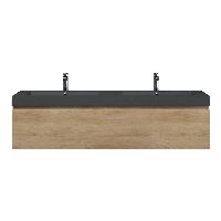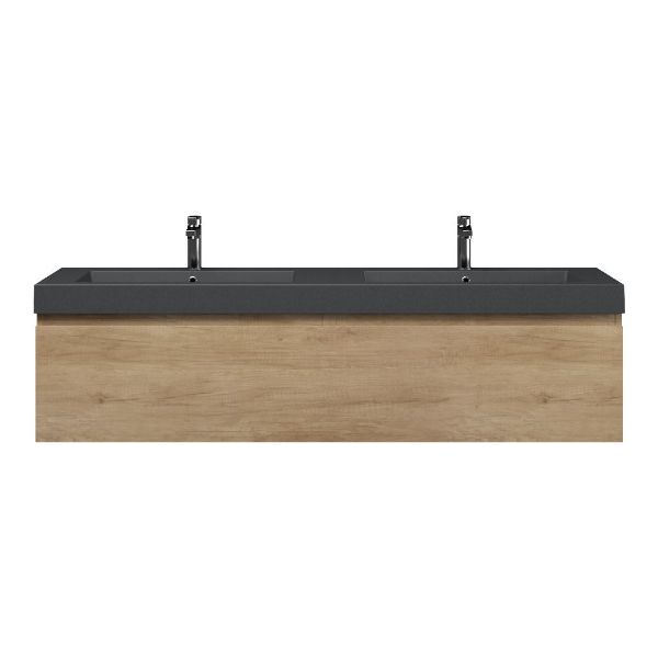 Greeploos badkamermeubel in de kleur olm is 160 cm breed.  De wastafel is vervaardig in quartz en heeft de kleur grijs mat. Dit badkamermeubel met deze wastafel is leverbaar tussen de 60 cm t/m 160 cm
