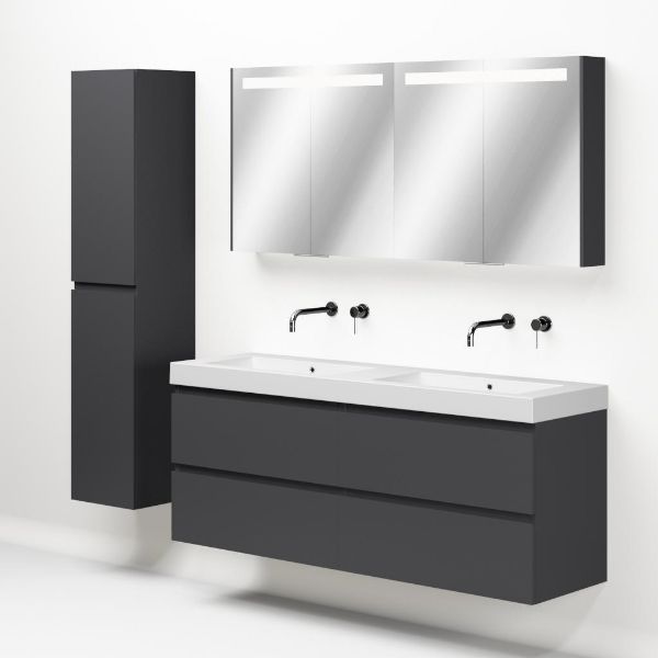 Greeploos badkamermeubel in de kleur antraciet mat is 160 cm breed.  De wastafel is vervaardig in quartz en heeft de kleur wit mat quartz. Dit badkamermeubel met deze wastafel is leverbaar tussen de 60 cm t/m 200 cm