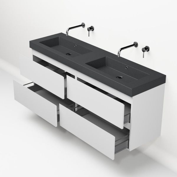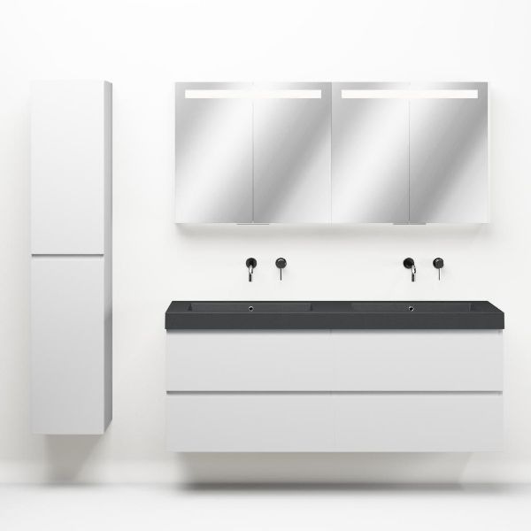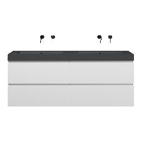 Greeploos badkamermeubel in de kleur wit mat is 160 cm breed. De wastafel is vervaardig in quartz en heeft de kleur grijs mat quartz. Dit badkamermeubel met deze wastafel is leverbaar tussen de 60 cm t/m 200 cm
