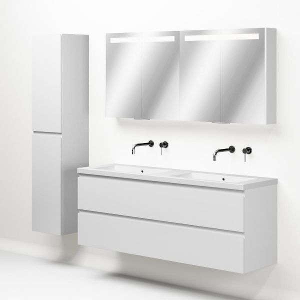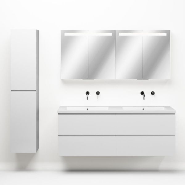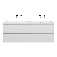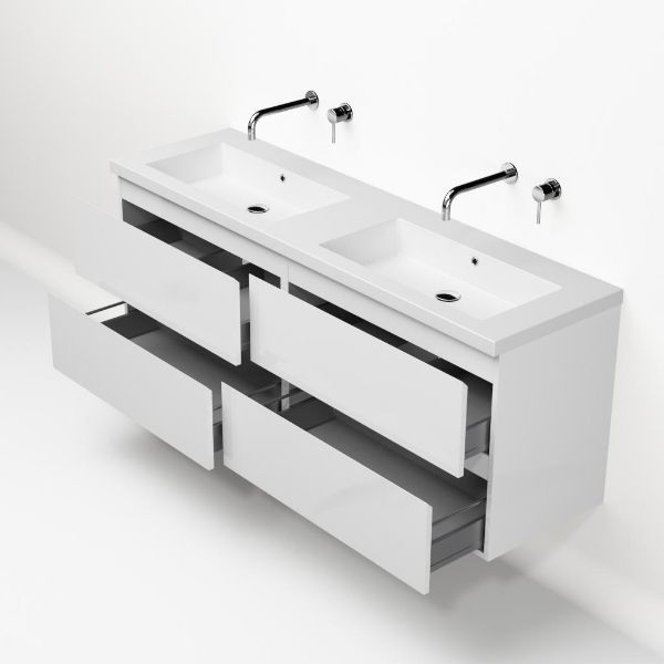 Greeploos badkamermeubel in de kleur wit hoogglans is 160 cm breed.  De wastafel is vervaardig in quartz en heeft de kleur wit mat quartz. Dit badkamermeubel met deze wastafel is leverbaar tussen de 60 cm t/m 200 cm