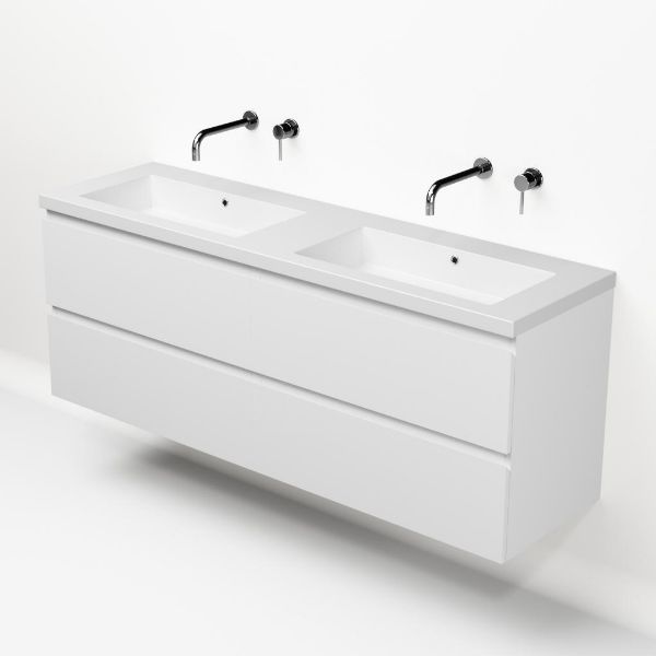 Greeploos badkamermeubel in de kleur wit mat is 160 cm breed. De wastafel is vervaardig in quartz en heeft de kleur wit mat quartz. Dit badkamermeubel met deze wastafel is leverbaar tussen de 60 cm t/m 200 cm