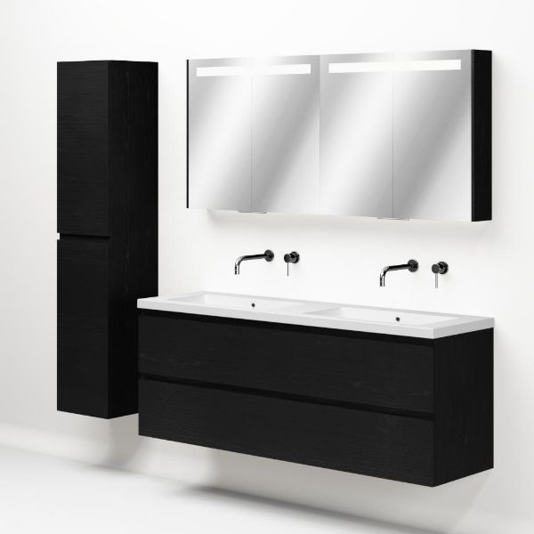 Greeploos badkamermeubel in de kleur zwart mat eiken is 160 cm breed.  De wastafel is vervaardig in quartz en heeft de kleur wit mat quartz. Dit badkamermeubel met deze wastafel is leverbaar tussen de 60 cm t/m 200 cm
