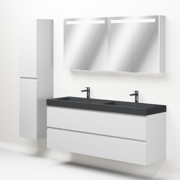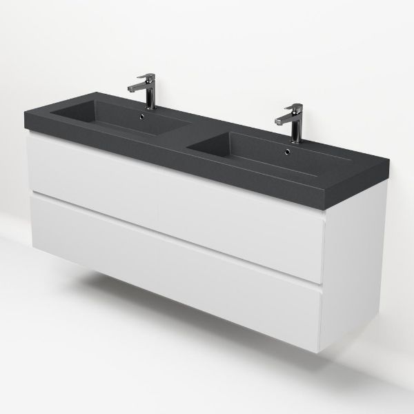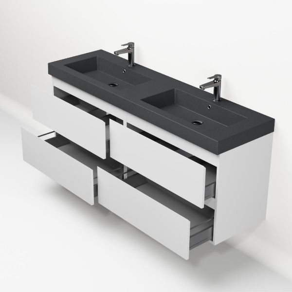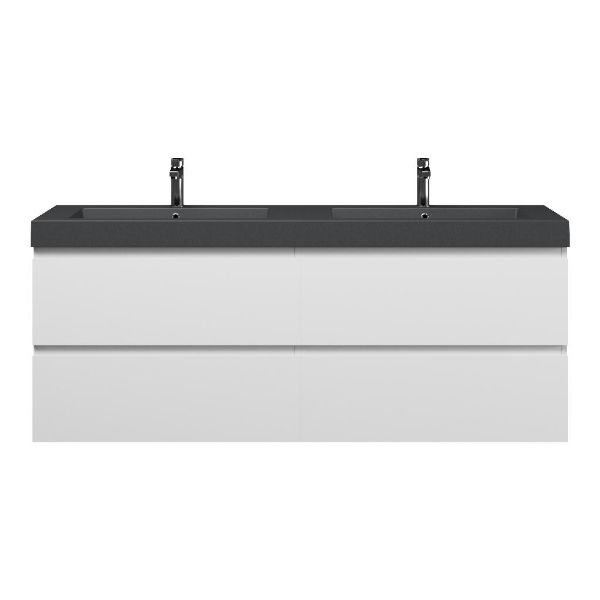 Greeploos badkamermeubel in de kleur wit mat is 160 cm breed.  De wastafel is vervaardig in quartz en heeft de kleur grijs mat. Dit badkamermeubel met deze wastafel is leverbaar tussen de 60 cm t/m 200 cm