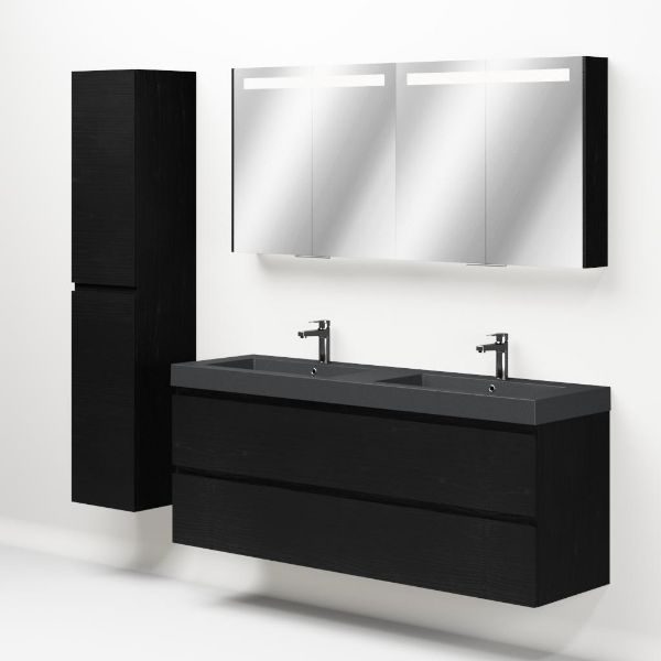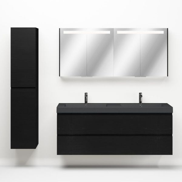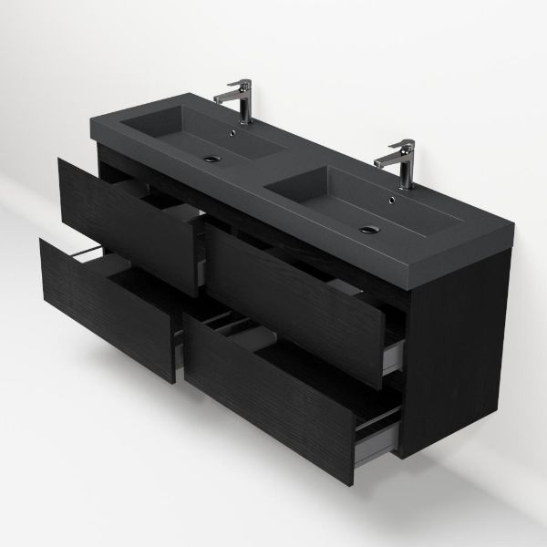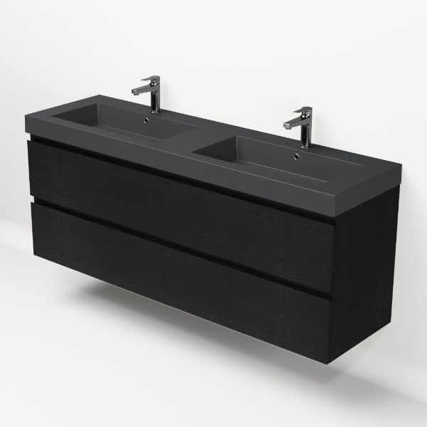 Greeploos badkamermeubel in de kleur zwart mat eiken is 160 cm breed. De wastafel is vervaardig in quartz en heeft de kleur grijs mat. Dit badkamermeubel met deze wastafel is leverbaar tussen de 60 cm t/m 200 cm