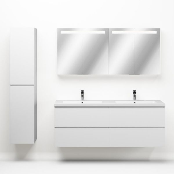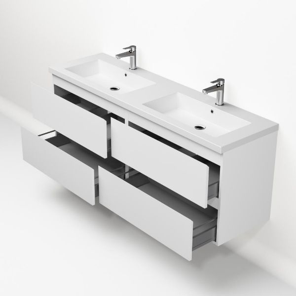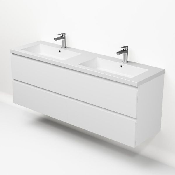 Greeploos badkamermeubel in de kleur wit mat is 160 cm breed.  De wastafel is vervaardig in quartz en heeft de kleur grijs mat. Dit badkamermeubel met deze wastafel is leverbaar tussen de 60 cm t/m 200 cm