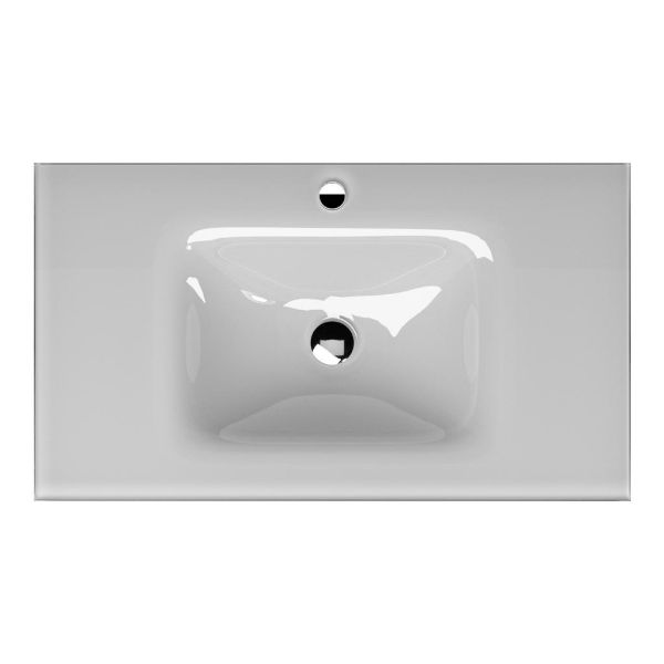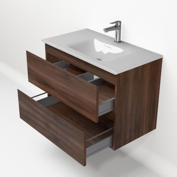 Greeploos badkamermeubel in de kleur walnoot is 80 cm breed. De wastafel is vervaardig in glas en heeft de kleur wit. Dit badkamermeubel met deze wastafel is leverbaar tussen de 60 cm t/m 140 cm