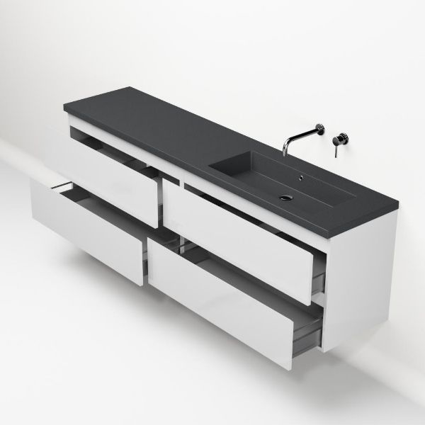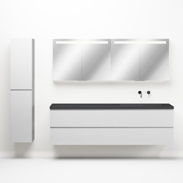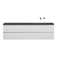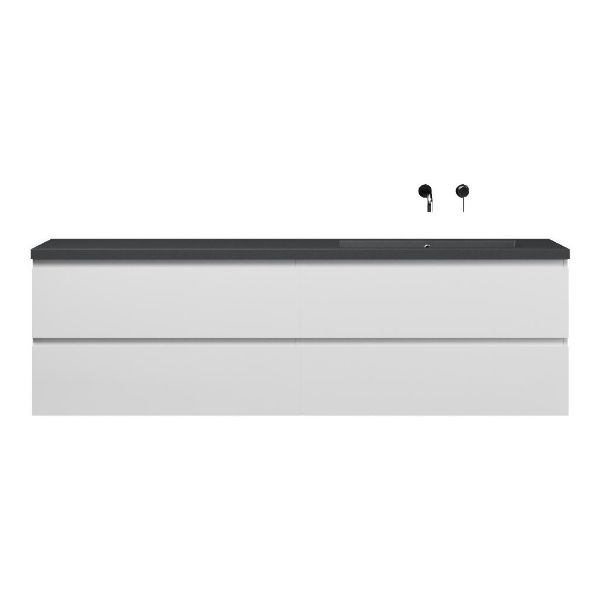 Greeploos badkamermeubel in de kleur wit hoogglans is 200 cm breed. De wastafel is vervaardig in quartz en heeft de kleur grijs mat quartz. Dit badkamermeubel met deze wastafel is leverbaar tussen de 60 cm t/m 200 cm