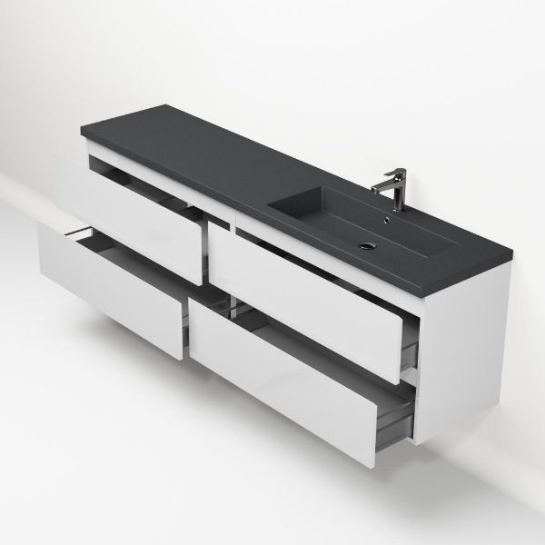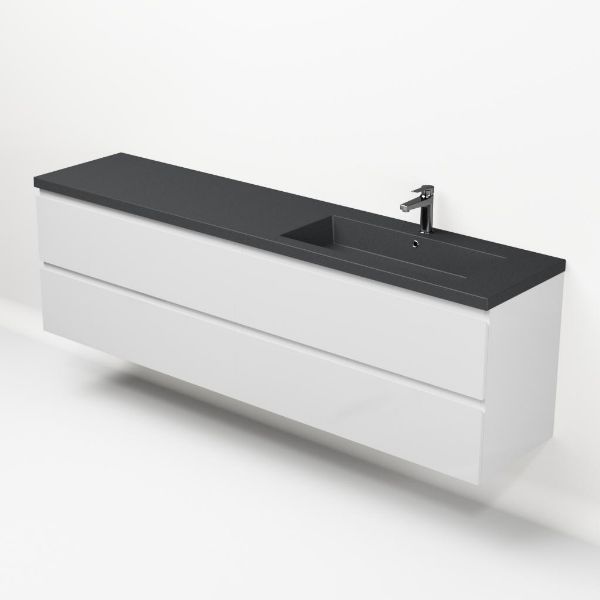 Greeploos badkamermeubel in de kleur wit hoogglans is 200 cm breed. De wastafel is vervaardig in quartz en heeft de kleur grijs mat quartz. Dit badkamermeubel met deze wastafel is leverbaar tussen de 60 cm t/m 200 cm