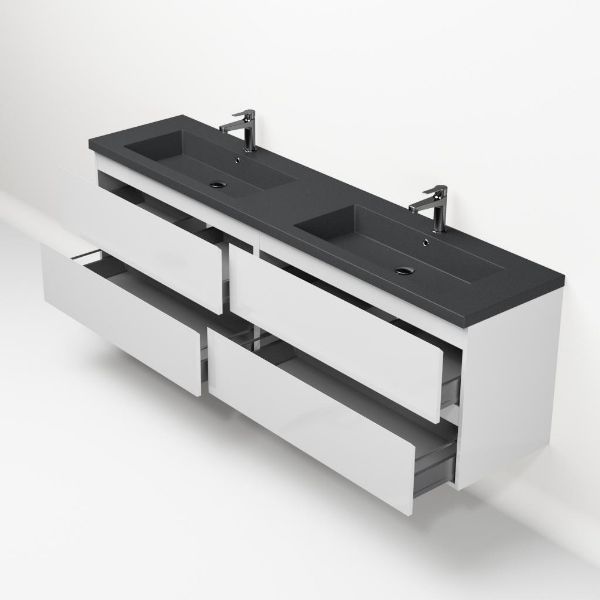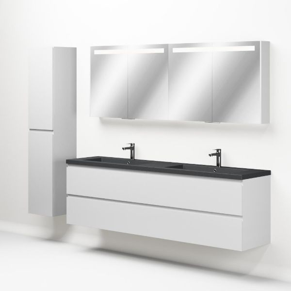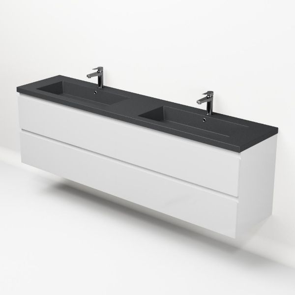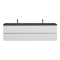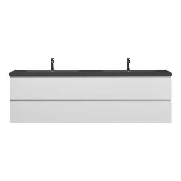 Greeploos badkamermeubel in de kleur wit hoogglans is 200 cm breed. De wastafel is vervaardig in quartz en heeft de kleur grijs mat quartz. Dit badkamermeubel met deze wastafel is leverbaar tussen de 60 cm t/m 200 cm