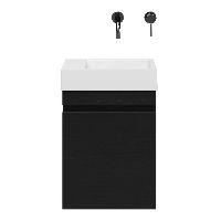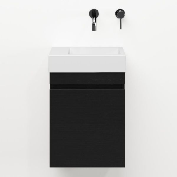 Greeploos fonteinmeubel in de kleur zwart mat eiken is 40 cm breed. De wastafel is vervaardig in polystone en heeft de kleur wit polystone met 0 kraangaten
