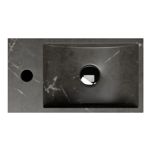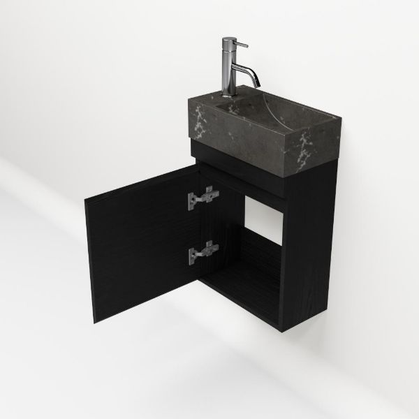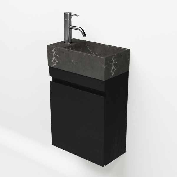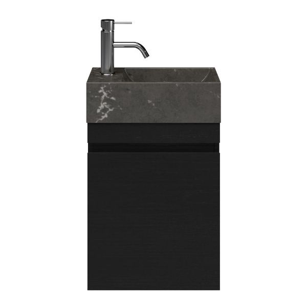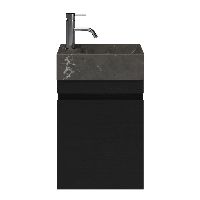Greeploos fonteinmeubel in de kleur zwart mat eiken is 40 cm breed. De wastafel is vervaardig in natuursteen en heeft de kleur blue stone met 1 kraangaten