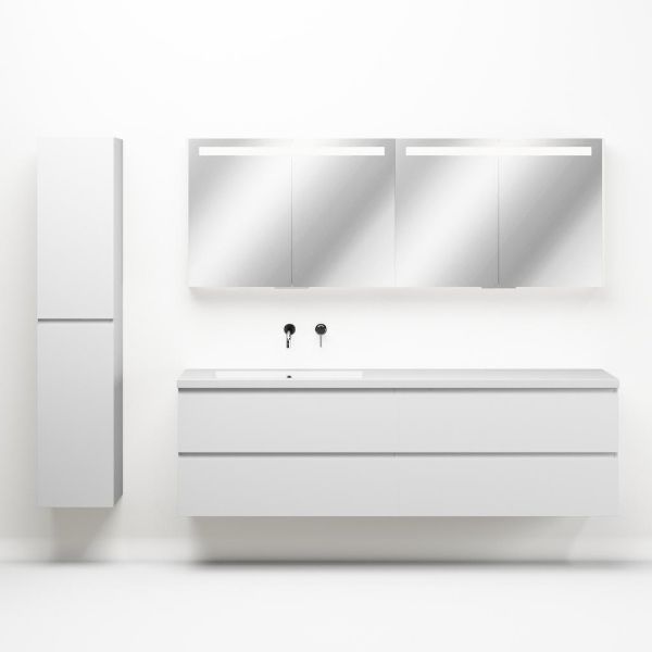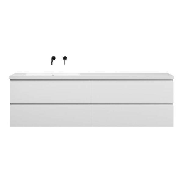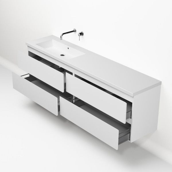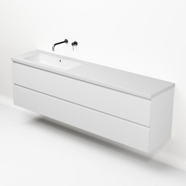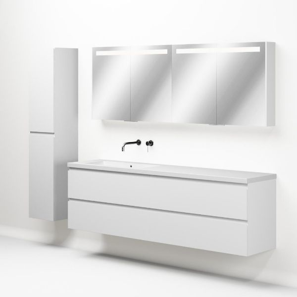 Greeploos badkamermeubel in de kleur wit mat is 200 cm breed. De wastafel is vervaardig in quartz en heeft de kleur wit mat quartz. Dit badkamermeubel met deze wastafel is leverbaar tussen de 60 cm t/m 200 cm