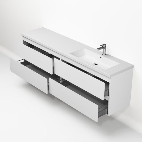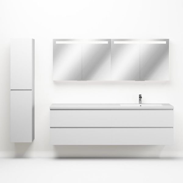 Greeploos badkamermeubel in de kleur wit mat is 200 cm breed. De wastafel is vervaardig in quartz en heeft de kleur wit mat quartz. Dit badkamermeubel met deze wastafel is leverbaar tussen de 60 cm t/m 200 cm