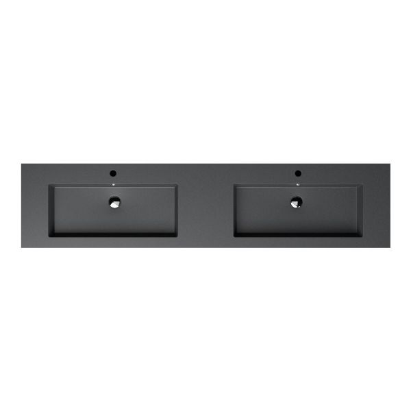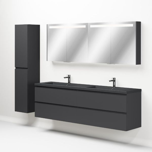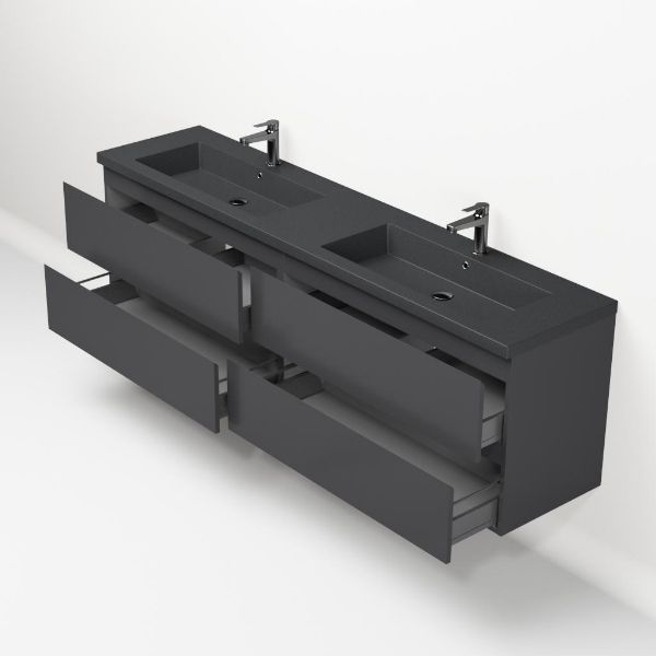 Greeploos badkamermeubel in de kleur antraciet mat is 200 cm breed. De wastafel is vervaardig in quartz en heeft de kleur grijs mat quartz. Dit badkamermeubel met deze wastafel is leverbaar tussen de 60 cm t/m 200 cm