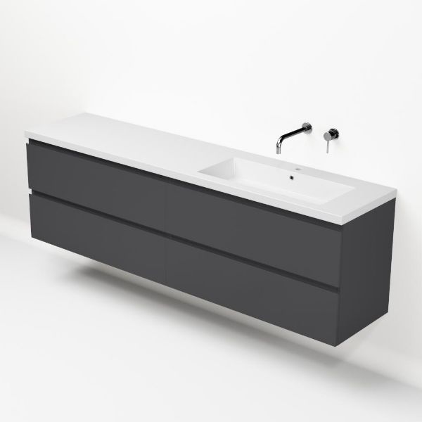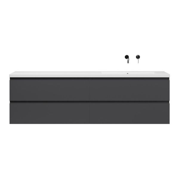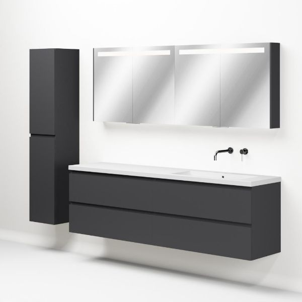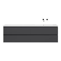Greeploos badkamermeubel in de kleur antraciet mat is 200 cm breed. De wastafel is vervaardig in polystone en heeft de kleur wit. Dit badkamermeubel met deze wastafel is leverbaar tussen de 60 cm t/m 200 cm