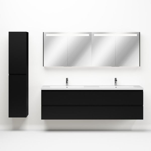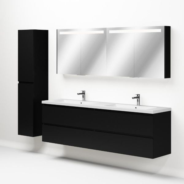 Greeploos badkamermeubel in de kleur zwart mat is 200 cm breed. De wastafel is vervaardig in quartz en heeft de kleur wit mat quartz. Dit badkamermeubel met deze wastafel is leverbaar tussen de 60 cm t/m 200 cm
