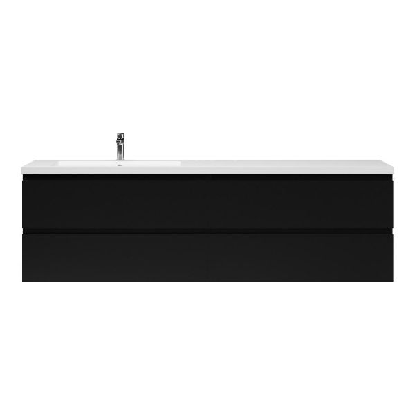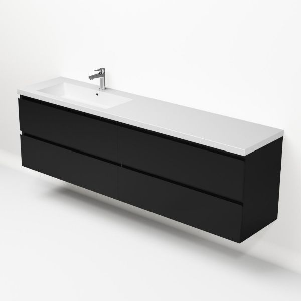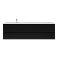 Greeploos badkamermeubel in de kleur zwart mat is 200 cm breed. De wastafel is vervaardig in quartz en heeft de kleur wit mat quartz. Dit badkamermeubel met deze wastafel is leverbaar tussen de 60 cm t/m 200 cm