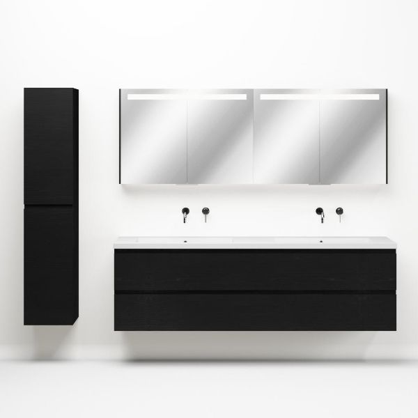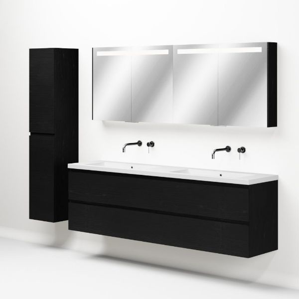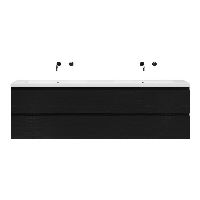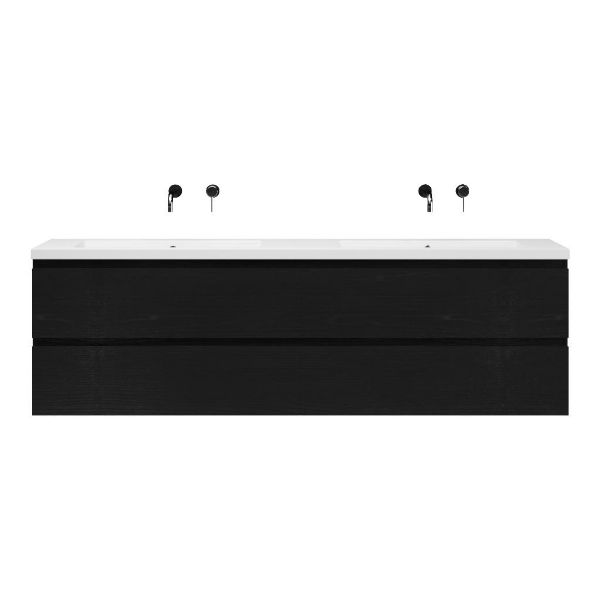 Greeploos badkamermeubel in de kleur zwart mat eiken is 200 cm breed. De wastafel is vervaardig in polystone en heeft de kleur wit. Dit badkamermeubel met deze wastafel is leverbaar tussen de 60 cm t/m 200 cm