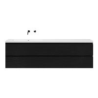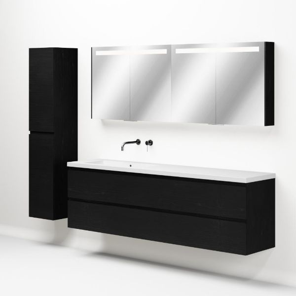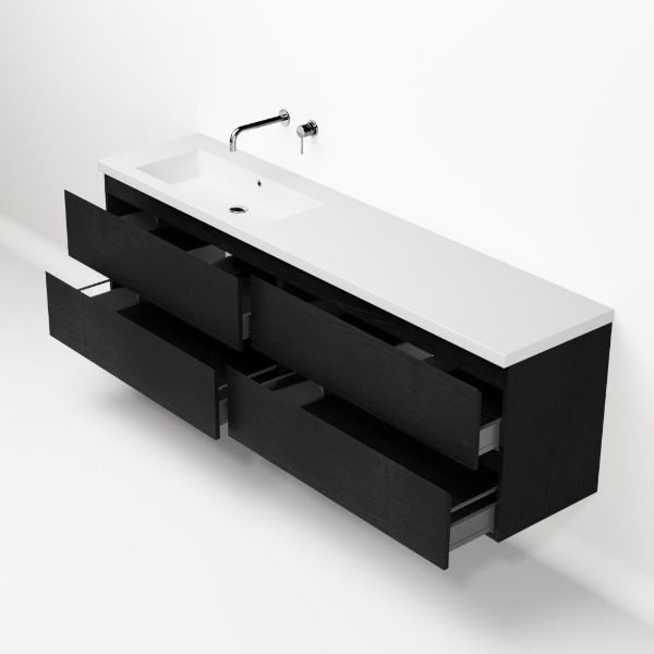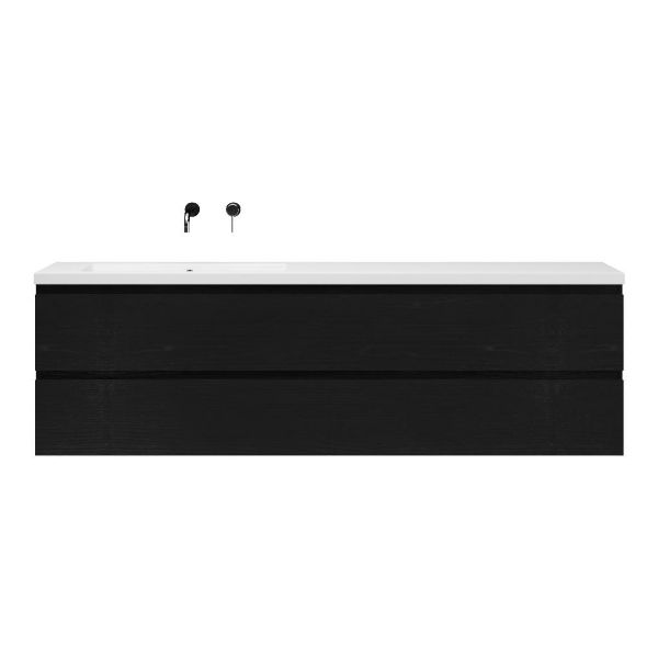 Greeploos badkamermeubel in de kleur zwart mat eiken is 200 cm breed. De wastafel is vervaardig in polystone en heeft de kleur wit. Dit badkamermeubel met deze wastafel is leverbaar tussen de 60 cm t/m 200 cm