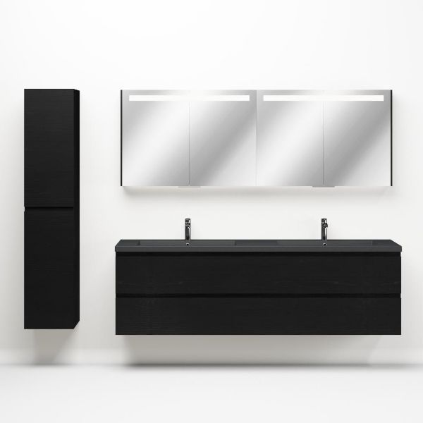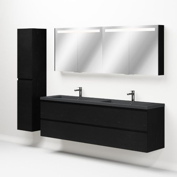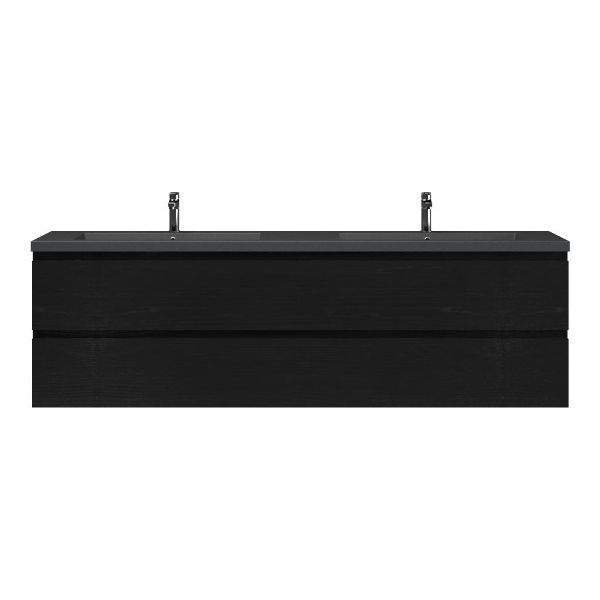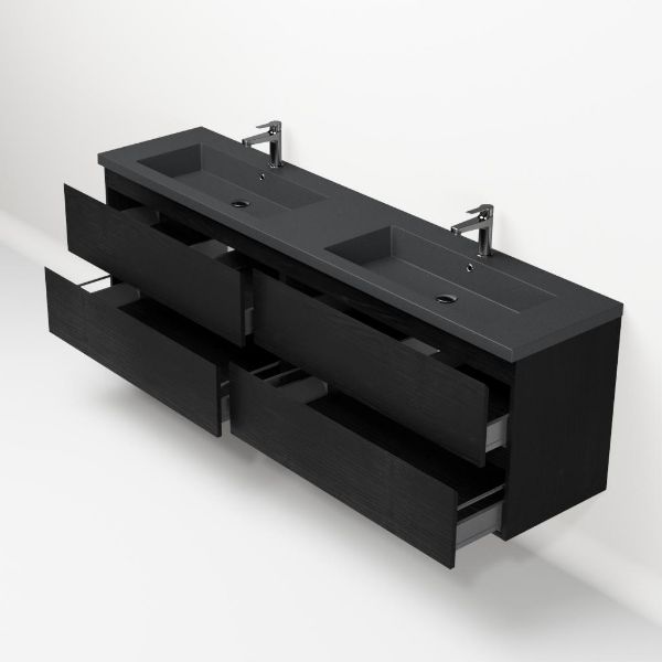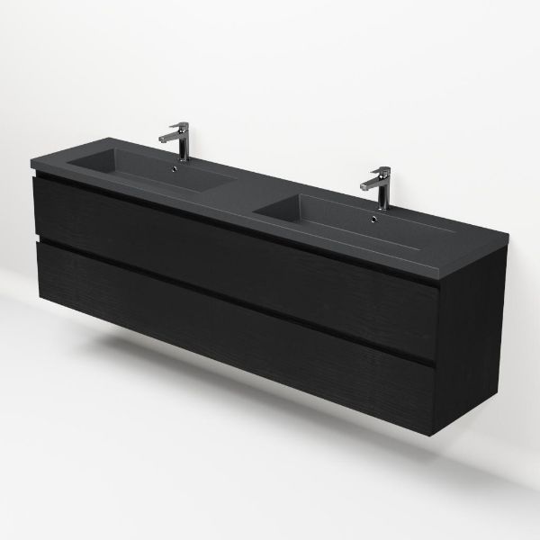 Greeploos badkamermeubel in de kleur zwart mat eiken is 200 cm breed. De wastafel is vervaardig in quartz en heeft de kleur grijs mat quartz. Dit badkamermeubel met deze wastafel is leverbaar tussen de 60 cm t/m 200 cm