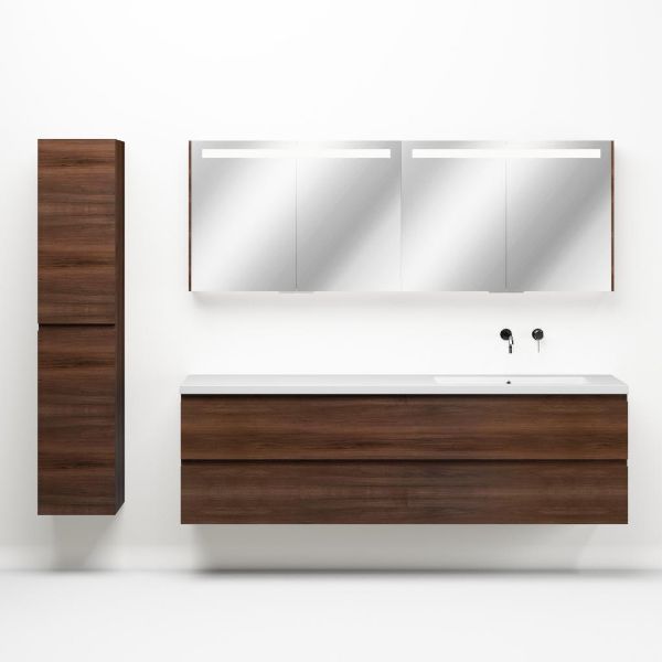 Greeploos badkamermeubel in de kleur walnoot is 200 cm breed. De wastafel is vervaardig in quartz en heeft de kleur wit mat quartz. Dit badkamermeubel met deze wastafel is leverbaar tussen de 60 cm t/m 200 cm
