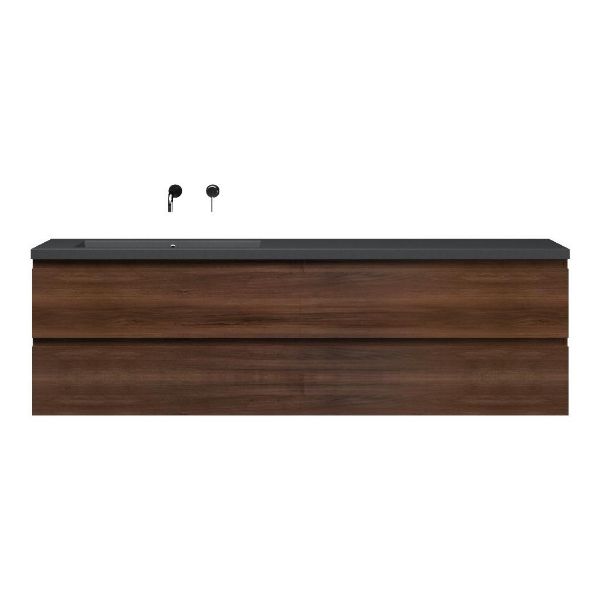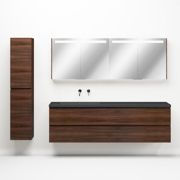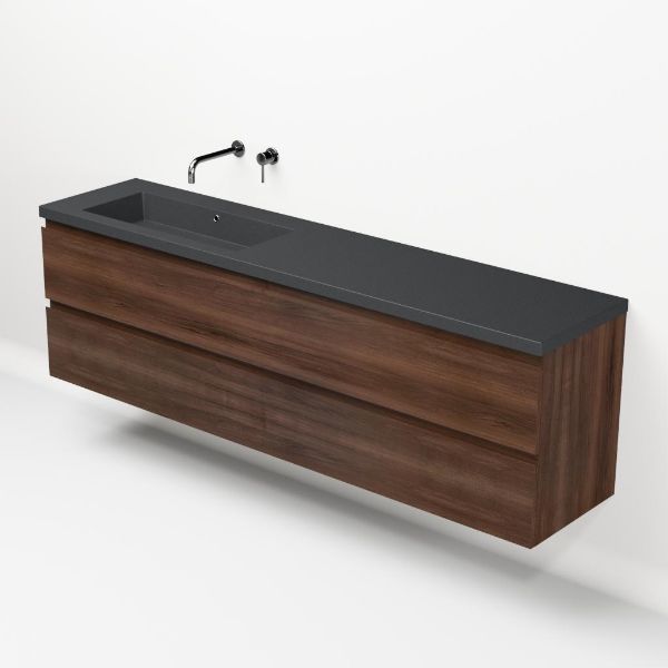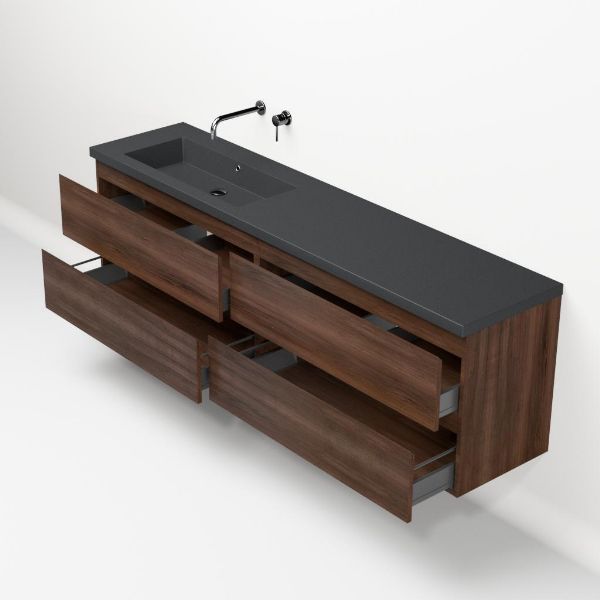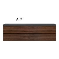 Greeploos badkamermeubel in de kleur walnoot is 200 cm breed. De wastafel is vervaardig in quartz en heeft de kleur grijs mat quartz. Dit badkamermeubel met deze wastafel is leverbaar tussen de 60 cm t/m 200 cm