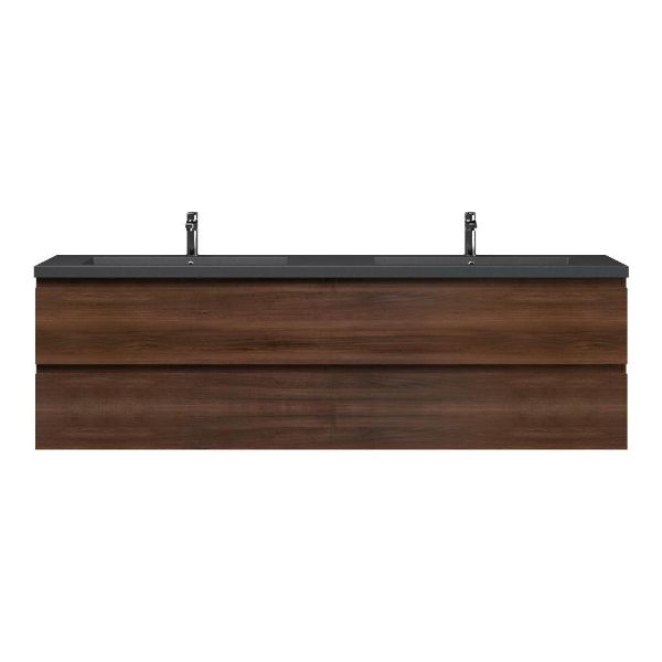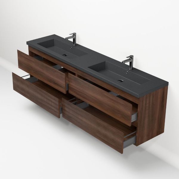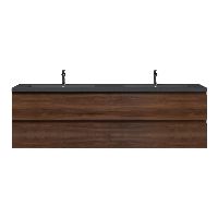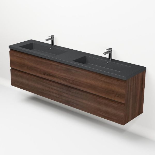 Greeploos badkamermeubel in de kleur walnoot is 200 cm breed. De wastafel is vervaardig in quartz en heeft de kleur grijs mat quartz. Dit badkamermeubel met deze wastafel is leverbaar tussen de 60 cm t/m 200 cm