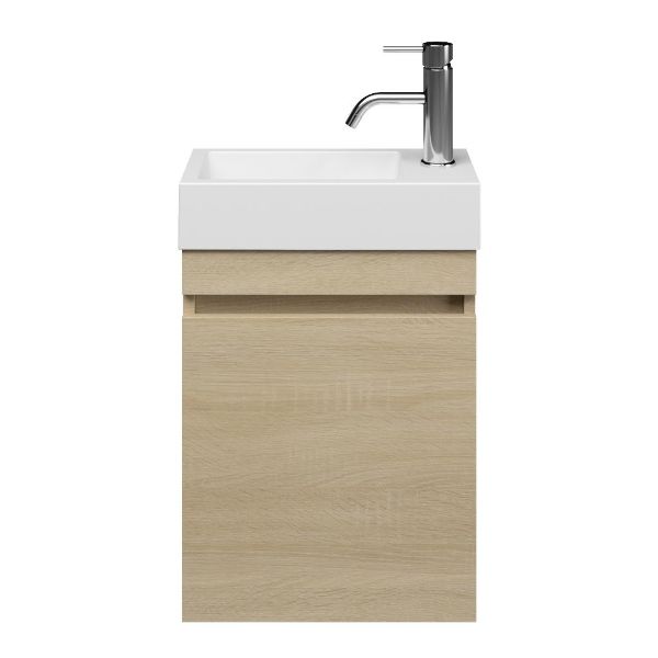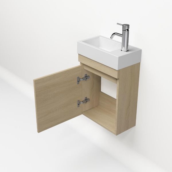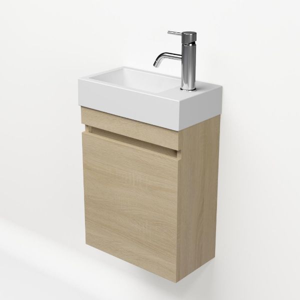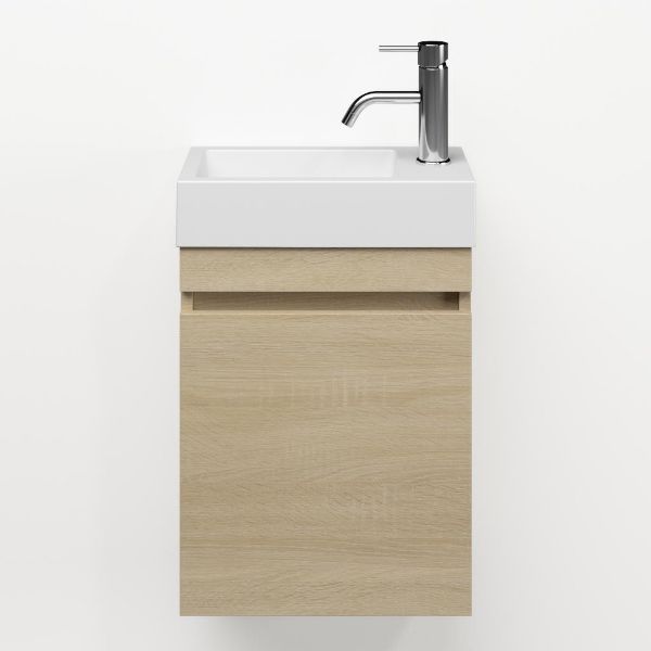 | | Bellanti Bona/Giada fonteinmeubel 40x22cm licht eiken met mat wit polystone wastafel met kraangat links/rechts |