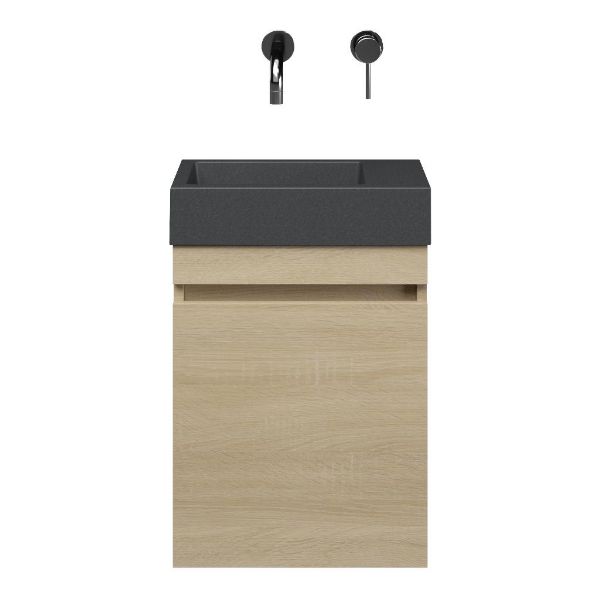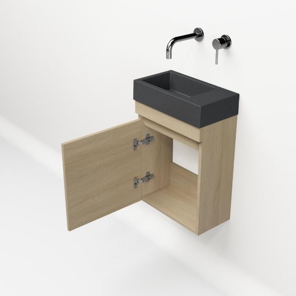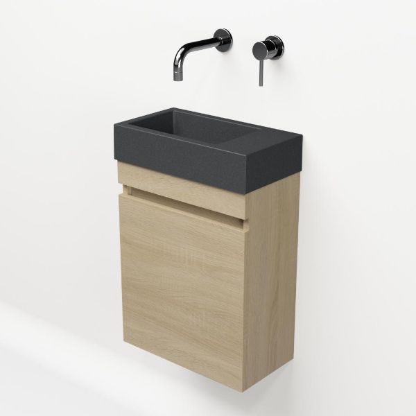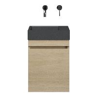 Greeploos fonteinmeubel in de kleur eiken licht is 40 cm breed. De wastafel is vervaardig in quartz en heeft de kleur mat grijs quartz met 0 kraangaten