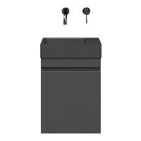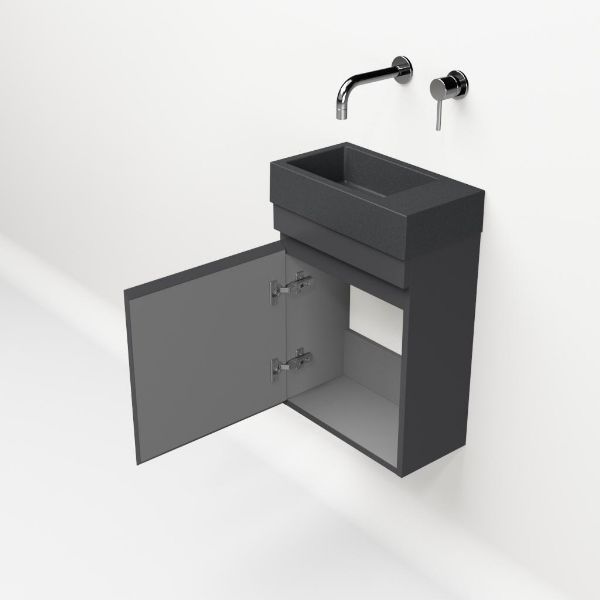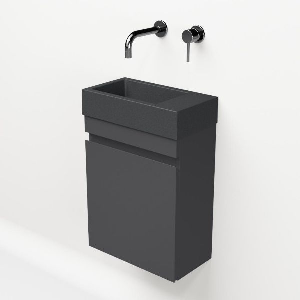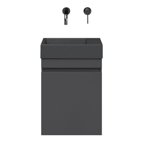 Greeploos fonteinmeubel in de kleur antraciet mat is 40 cm breed. De wastafel is vervaardig in quartz en heeft de kleur mat grijs quartz met 0 kraangaten