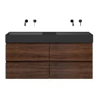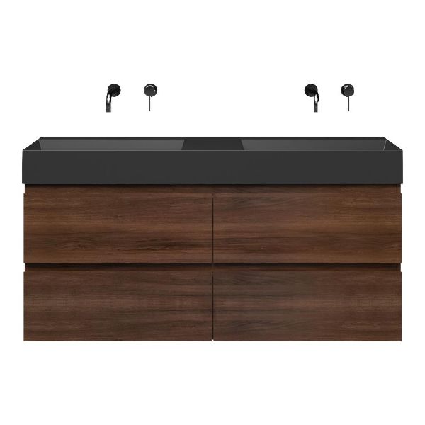 Greeploos badkamermeubel in de kleur walnoot is 140 cm breed. De wastafel is vervaardig in keramiek en heeft de kleur antraciet mat keramiek. Dit badkamermeubel met deze wastafel is leverbaar tussen de 60 cm t/m 160 cm