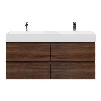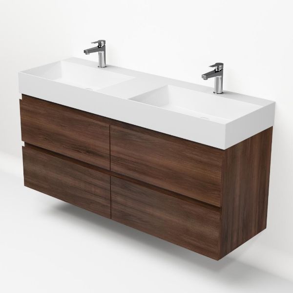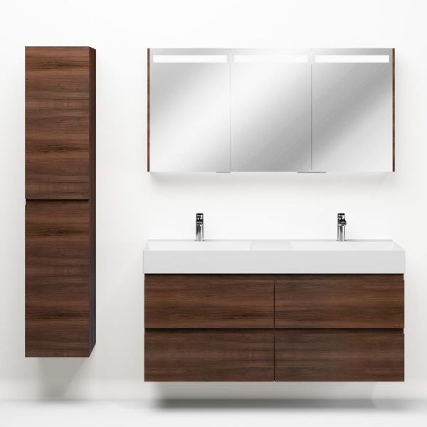 Greeploos badkamermeubel in de kleur walnoot is 140 cm breed. De wastafel is vervaardig in keramiek en heeft de kleur wit keramiek. Dit badkamermeubel met deze wastafel is leverbaar tussen de 60 cm t/m 160 cm